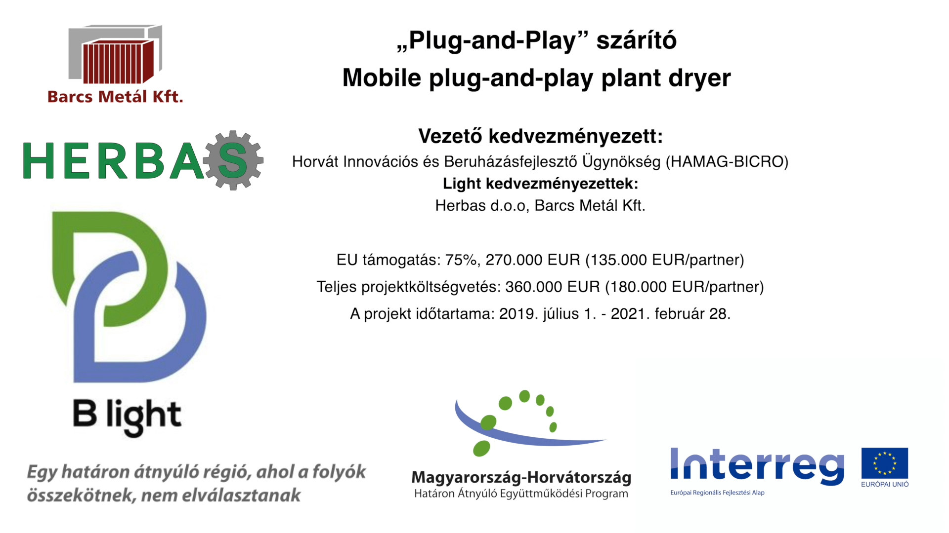 A Barcs Metál Kft. több évtizedes szakmai tapasztalatok alapján tervez és gyárt konténereket, míg a horvát vállalkozás leginkább gyógynövények, dohány-, illetve mezőgazdasági termények feldolgozásához szükséges berendezések gyártására specializálódott. A közös tudásra és tapasztalatra építve, fejlesztették ki közösen a gyógynövénynövények és termények hordozható „plug-and-play” szárítóját, amely egy negyven lábas, speciális, mobilizálható szárítókonténer.